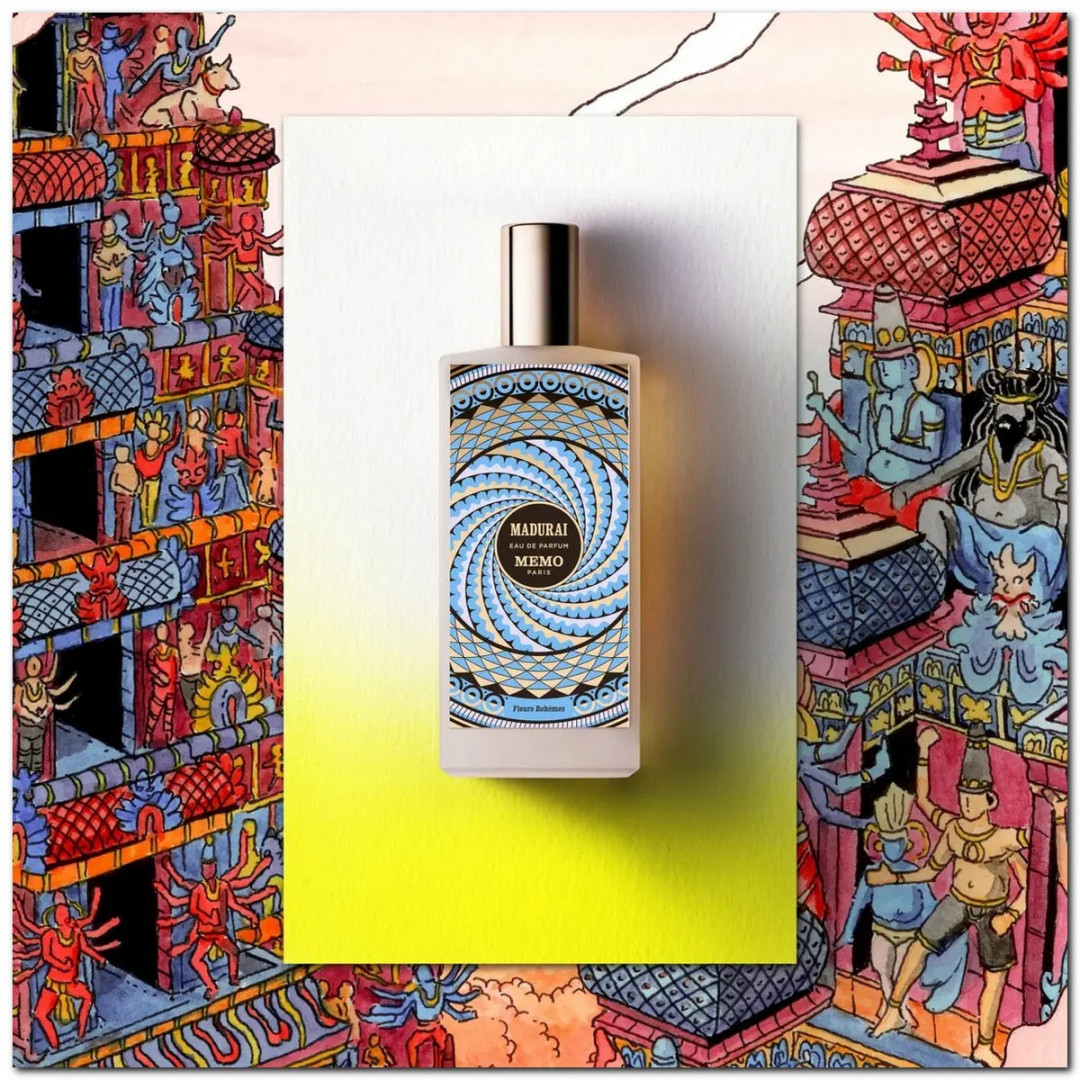 Воспоминание об Индии, пропитанное богатым и воздушным ароматом жасмина самбак и более сливочным ароматом сандалового дерева, — вот что определило композицию Madurai. Аромат, будоражащий чувства яркими нотами цитрусовых и куркумы, похожий на красочный рыночный прилавок. О флаконе: мадурайская тарелка вдохновлена гипнотическими мотивами, которые можно найти на потолке храма.